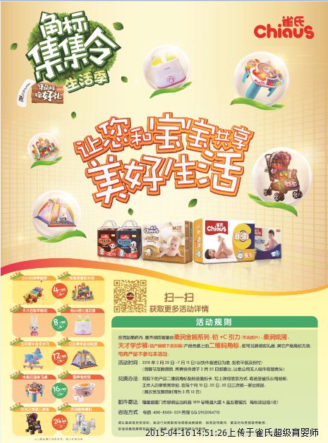 在活动时间(2月25日-7月15日)内,消费者购买参与活动的产品“柔润金棉、铂+C引力(不含尿片)、柔润炫薄、天才学步裤(该产品剪下条形码)”,将产品包装上的二维码角标剪下,集齐相应数量的产品包装二维码角标,寄回公司,即可兑换相应赠品,其他产品角标无效,电商产品不参与本活动。角标兑换邮寄地址:福建省厦门市思明区吕岭路1819号精图大厦A座五楼 雀氏(福建)实业发展有限公司 角标项目组收 联系电话:400-8888-339